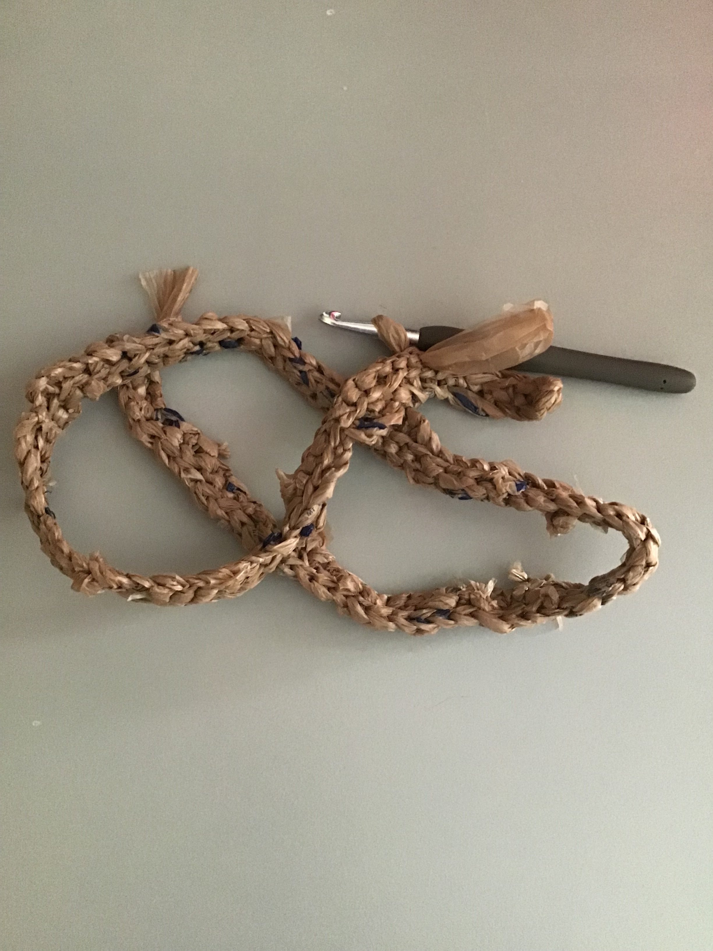 A student created "plarn," a yarn made from plastic bags, and began a knitting project with it!