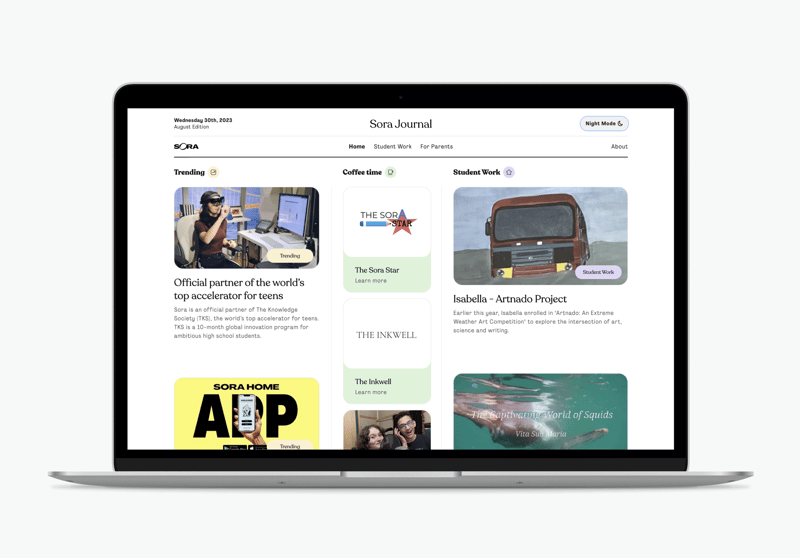 We are thrilled to share the inaugural edition of the Sora Journal. This period newsletter includes exciting news about student achievements and program highlights, links to our students newspaper (The Sora Star) and literary magazine (the Inkwell), news and notes about our curriculum, and even a few Sora company announcements.