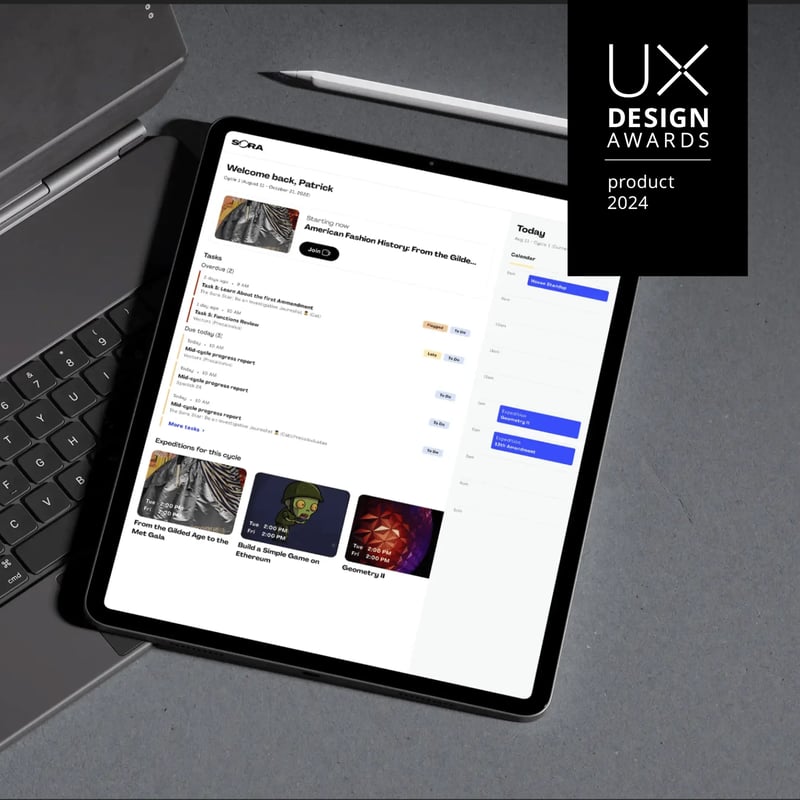 We are proud to announce that Sora has been named a winner of the UX Design Award in the Product category for Sora Home, our innovative learning experience management platform. There were 415 participants from 53 nations, 118 nominees, and just 7 award recipients.