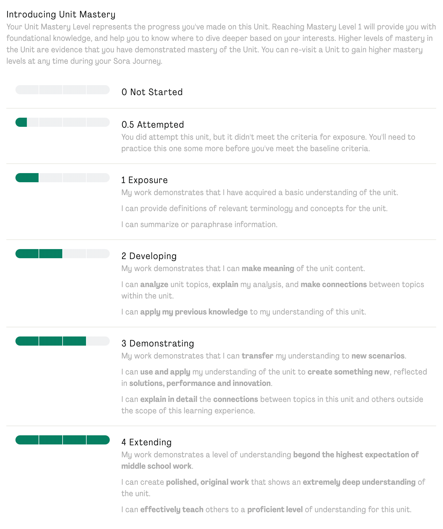 Unit Mastery Level represents progress made in a Unit. Gaining Exposure (Mastery Level 1) provides foundational knowledge to graduate, and knowing where to dive deeper into an interest. Higher levels of mastery in the Unit are evidence that the student has demonstrated mastery of the Unit. Students can revisit a Unit to gain higher mastery levels at any time during their Sora Journey.
