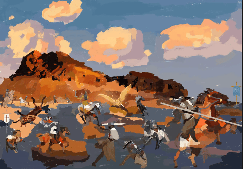 For the spring issue of The Inkwell, Darah submitted an original artwork from her recent expedition on The Crusades.The artwork depicts the Battle of Antioch, where Crusaders, inspired by the discovery of the Holy Lance, charge against a larger Turkish force led by Kur Bugha, with a focus on conveying the energy of battle, bias in representation, and an attempt to capture historical accuracy and motion, while incorporating angels and symbolic imagery.